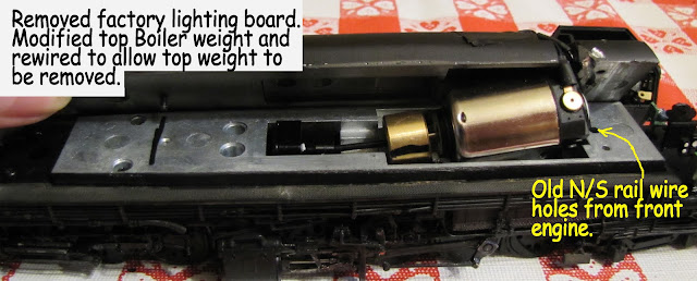 Once the wires are clear, the top boiler weight should come off easily. The motor is in the firebox and just forward of the fixed cylinders is the main gear tower. I am not sure how the gear tower is secured to the lower boiler and frame drive shafts to the wheels. (I find this out later... and it's a pain!)